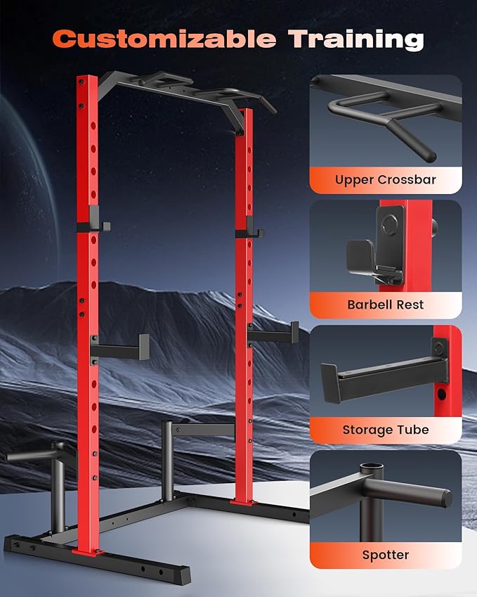 - 【Versatile Workouts】Our multi-functional power rack is adeptly designed to cater to both novices and athletes. The workout machine incorporates a range of attachments for versatile workouts, such as dip station, pull up, chin up, push up, etc. We are also equipped with upper and lower pulley system for lat pulls down, seated rowing. This power rack cage gives you the flexibility for various strength training workout, within a safe environment and in a compact space.