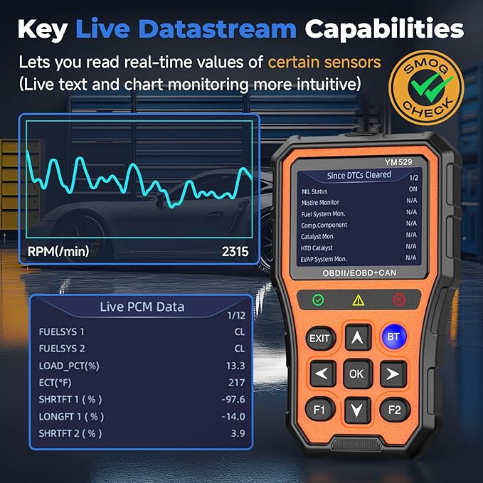 - 【Engine Health Maintenance】The YM529 OBD-II engine diagnostic scanner enables quick-scan diagnostics, reads/display live fault code definitions, troubleshoots root causes, clears codes, and turns off MIL (Malfunction Indicator Light) lights.