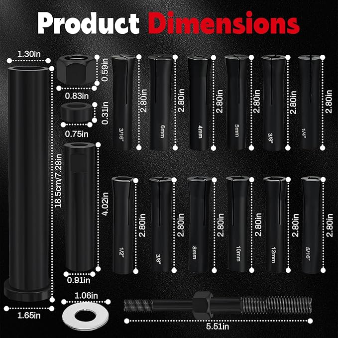 - Master Dowel Pin Puller Set: Master set includes both Set and metric collets