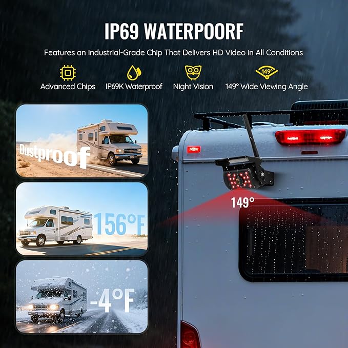 - Conquer Every Season with IP69K Waterproof Technology: Banish weather-related worries forever. Built with an IP69K waterproof housing, this camera is designed to perform flawlessly through rain, snow, dust, and high-pressure washdowns, maintaining clear visibility at all times. Experience no more foggy lenses or distorted images—this wireless backup camera delivers a crystal-clear feed regardless of extreme conditions.