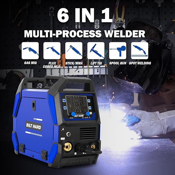 BILT HARD Aluminum 250A MIG Welder, Gas MIG/Flux Core MIG/Lift TIG/Stick/Spot Welding/Spool Gun Compatible 6-in-1 Welding Machine, 110V/220V Multi-Process Welder w/LED Display, IGBT Inverter