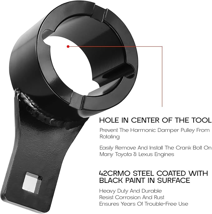 - Keeps the Crank Pulley Steady:Designed to keep the harmonic damper pulley from spinning while you remove or torque the pulley bolt. Makes it easy to remove and install crank bolts for Toyota and for Lexus engines without the hassle.