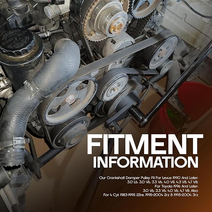 - Fitment Information:Our Crankshaft Damper Pulley fit for Lexus 1990 and later: 3.0 L6, 3.0 V6, 3.3 V6, 4.0 V8, 4.3 V8, 4.7 V8;for Toyota 1996 and later: 3.0 V6, 3.3 V6, 4.0 V6, 4.7 V8. also for 4 cyl: 1983-1995 22RE, 1995-2004 2RZ & 1995-2004 3RZ