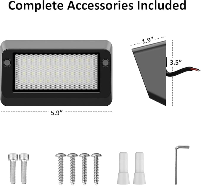 - Easy Installation with Complete Kit: Measuring 5.9 x 3.6 x 1.9 inches, this compact light fixture comes with all necessary mounting hardware. It's designed for hassle-free installation and is compatible with 10-30V systems, fitting a wide range of RVs, campers, and travel trailers. {Operates with RV interior switch — no switch on the unit.}