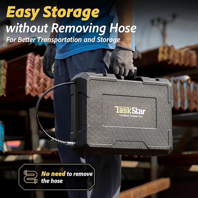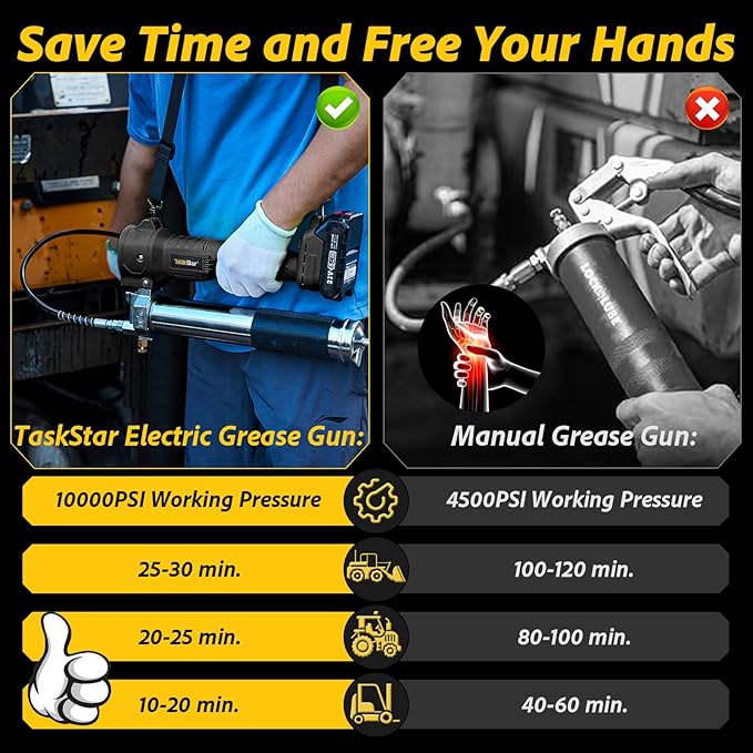- Outstanding Performance: TaskStar's electric grease gun offers up to 10,000 PSI powered by a robust motor; automatic pressurization and a 3.0 oz/min pump ensure smooth, efficient greasing; designed to speed up regular maintenance tasks across multiple equipment