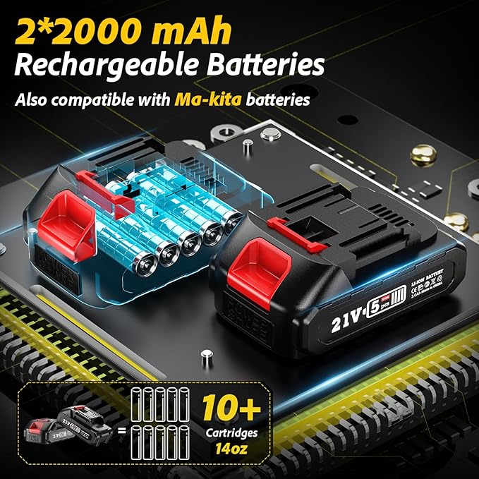 - Long-Lasting Power: Comes with two 21V 2000 mAh batteries, ensuring seamless operation; fully charged batteries can grease up to 10 tubes; a spare battery guarantees continuous operation, even in outdoor conditions; compatible with Makita batteries