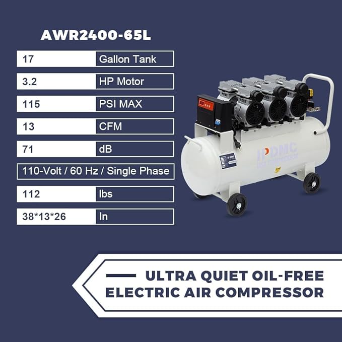 - Oil-free Air Compressor: Voltage: 110V; Power: 3HP; Max. Pressure: 115psi; Tank: 17Gal