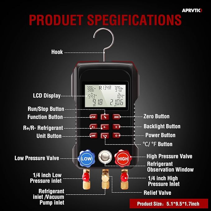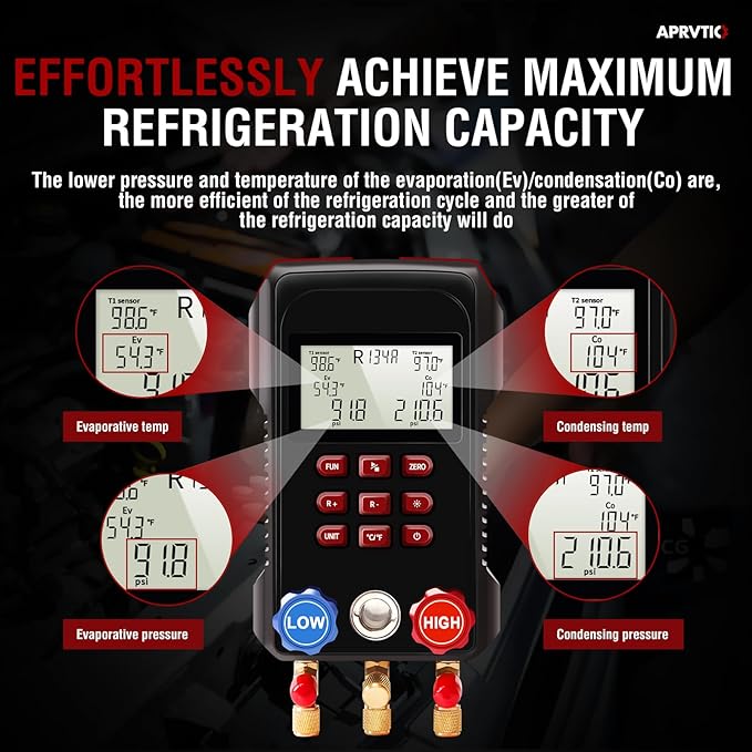 - Highly Powerful Features: The digital pressure gauge can measure double pressure at the same time, as well as dual temperature measurement, superheat and subcooling calculation. Also it tests percentage of vacuum measurement, pressure leak measurement, leak time speed record