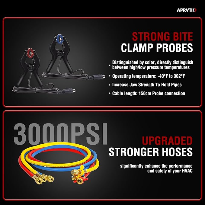 Digital HVAC Gauge, Aprvtio AMF-300 AC Manifold Gauge Set with 3000PSI Hoses and 2 Wired Temperature Clamp Probes, Refrigerant Gauges for Automotive HVAC System HVAC Tools Kit R134a R22 R12