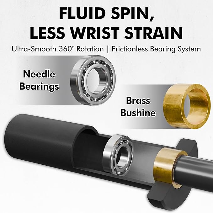 • 【 High-quality Bearing and Bushing】Mikolo Olympic barbell sleeves feature needle bearings and brass bushings. What sets us apart from other competitive products is our use of 8 needle bearings, providing enhanced friction reduction and catering to the demands of swift weightlifting rotations. Each sleeve end is equipped with snap rings, ensuring stable port positioning.