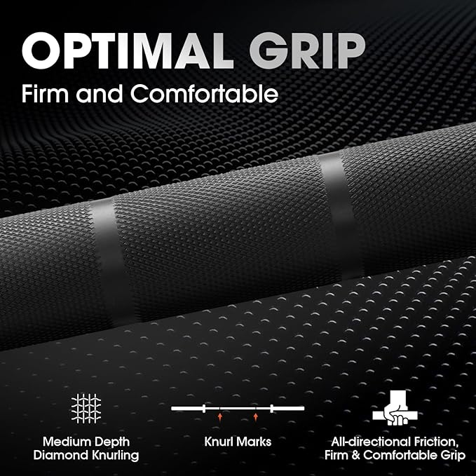 - 【Premium Knurled Logo】Our barbell proudly showcases a dual-marking knurl, clearly indicating the correct hand positions for both powerlifting and Olympic weightlifting. The 1.2 mm diamond knurling on the surface not only ensures a secure grip but also mitigates the impact of sweating, preventing the loss of friction.