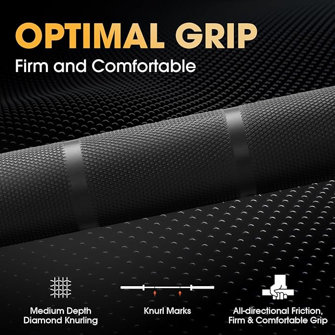 - 【Premium Knurled Logo】Our barbell proudly showcases a dual-marking knurl, clearly indicating the correct hand positions for both powerlifting and Olympic weightlifting. The 1.2 mm diamond knurling on the surface not only ensures a secure grip but also mitigates the impact of sweating, preventing the loss of friction.