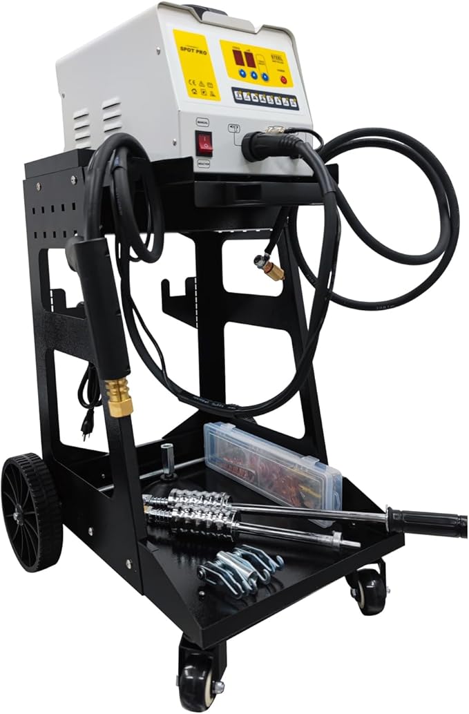 - Great Material: The spot welder has an all-aluminum frame which is equipped with movable wheels, labor-saving and sturdy to use. In addition, the steel dent pulling machine has oxygen-free copper cable, which has excellent insulation performance and electrical conductivity. High strength thickened case with thickness up to 1.8mm