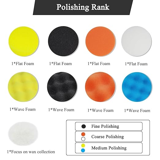 - Car Polishing Buffing Kit,11 Pcs Car Foam Polishing Pads Kit,8 pcs 3" Sponge Polishing Pads, 1 pcs Wool Buffing Pad,1 pcs Drill Adapter,1 pcs Suction Cup