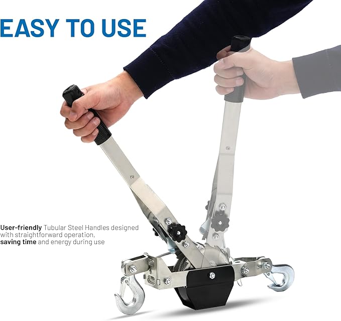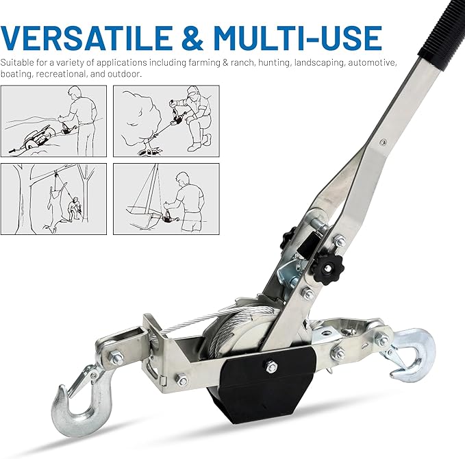 - Comes with a long industrial hand ratchet handle featuring a PVC coated grip for added leverage and control, plus 2 latching hooks that enhance safety and versatility for off-road vehicle recovery, fence pulling, and more.