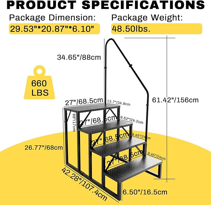 - 660lbs Weight Capacity: Our porch steps can hold up to 660 pounds, providing great stability for adults and heavy loads, so you can step with confidence. These steps utilize triangular bars for enhanced stability, minimizing sway and reducing the risk of accidents.