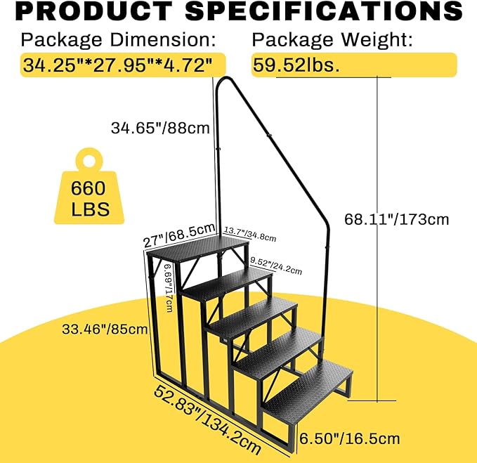 - 660lbs Weight Capacity: Our porch steps can hold up to 660 pounds, providing great stability for adults and heavy loads, so you can step with confidence. These steps utilize triangular bars for enhanced stability, minimizing sway and reducing the risk of accidents.