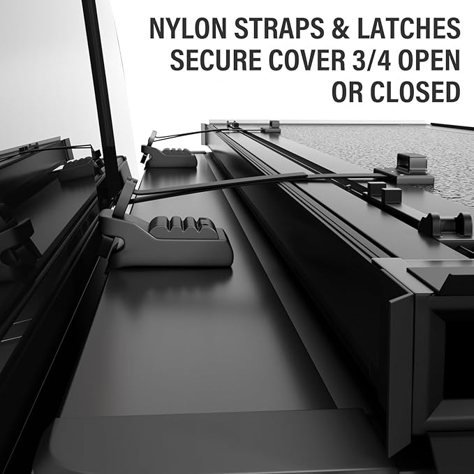 - Secure Auto-Latch Mechanism - The quad-fold design offers quick cargo access, with nylon straps securing the cover in the 2/4 open position while driving. The latch allows for one-finger release to open and locks automatically when you close the cover.