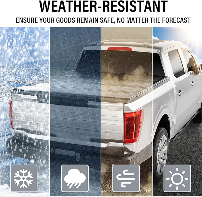 - All-Weather Protection - Engineered with rust-resistant aluminum panels and a black powder-coated frame, this truck tonneau cover is designed to endure harsh conditions. Includes a secure track and rail mounting system with drain tubes, safeguarding your cargo from rain, dust, snow and dirt.