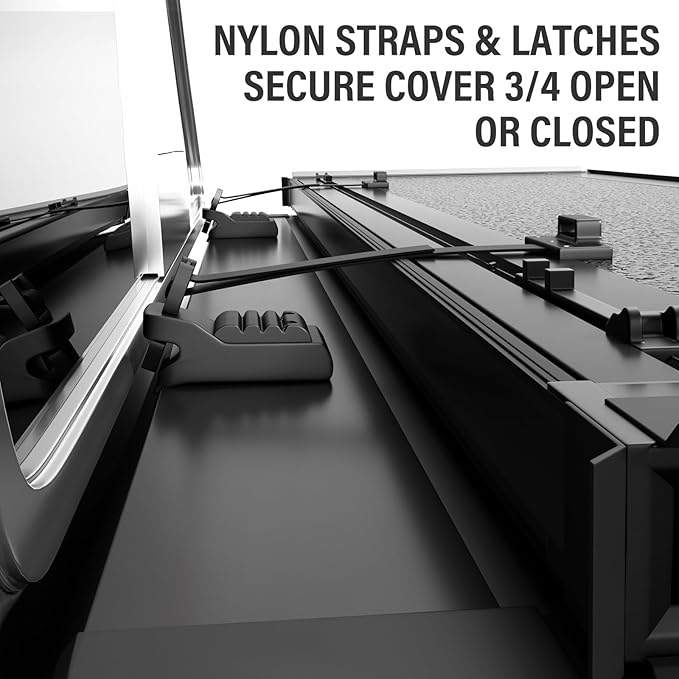 - Secure Auto-Latch Mechanism - The quad-fold design offers quick cargo access, with nylon straps securing the cover in the 2/4 open position while driving. The latch allows for one-finger release to open and locks automatically when you close the cover.