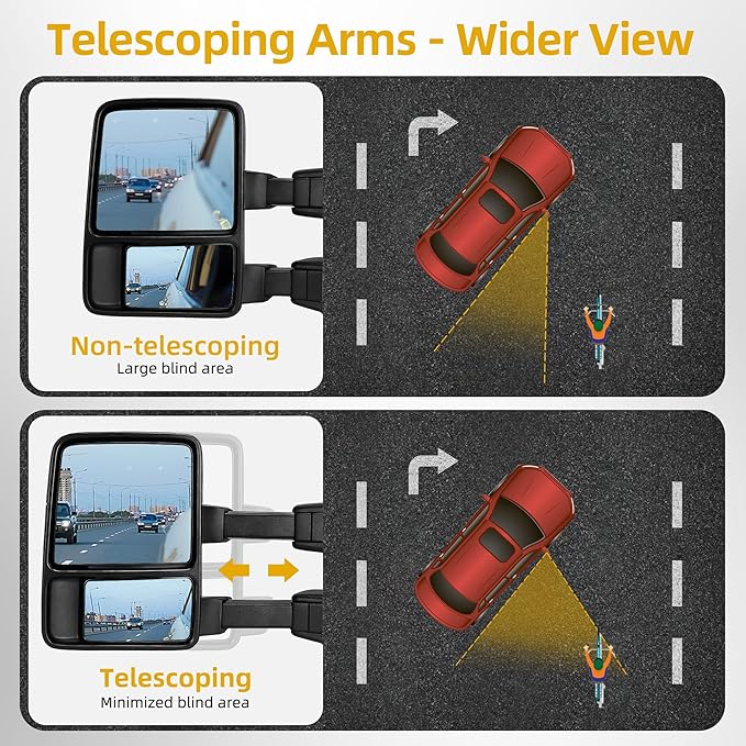 - Advanced Functionality: Power adjustable mirror for customized visibility. Power heated plane mirrors ensure clarity in cold weather. With manually adjustable convex lens, halogen lights, manual telescoping and manual folding, the side mirrors can enhance your driving experience