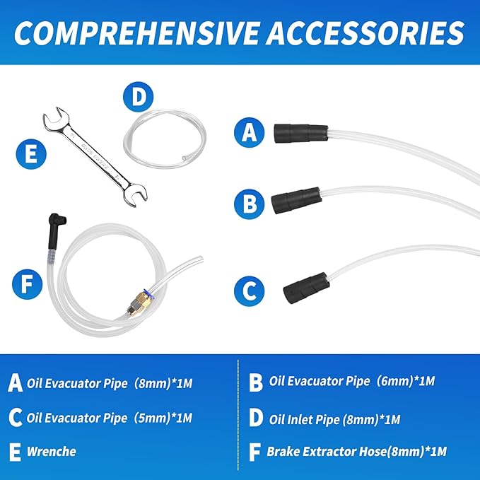 - 1.COMPLETE ACCESSORIES :Our oil extractor includes an 8L fuel tank, 4 oil change hoses and 1 brake exhaust hose. Complete accessories, precision machining, easy to assemble and use. Equipped with a pressure gauge to check the internal vacuum pressure during operation. Ensures the safest working operation.
