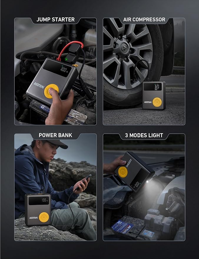 - MULTI-FUNCTION - It's a car jump starter, air compressor, portable 12000mAh power bank and an LED flashlight with 3 modes (Stable, Strobe, SOS). This 6-in-1 multi-function tool is a must-have in any road trip kit.
