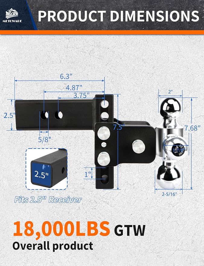 - MULTIPLE CAPACITY: This Trailer Hitches fits a 2.5" receiver. It also includes all 3 standard ball sizes and has 4 inch of drop/rise space. Rotatable tri-ball can satisfy all your towing needs, 1-7/8'' hitch ball has towing capacity of 3,500lbs, 2'' hitch ball has towing capacity of 7,500lbs, while 2-5/16'' hitch ball has towing capacity of 12,500lbs, so you can switch between different trailer hitch balls to accommodate different towing loads, and haul heavier loads such as heavy trucks or rvs with ease. (Overall product GTW of 18,000lbs)