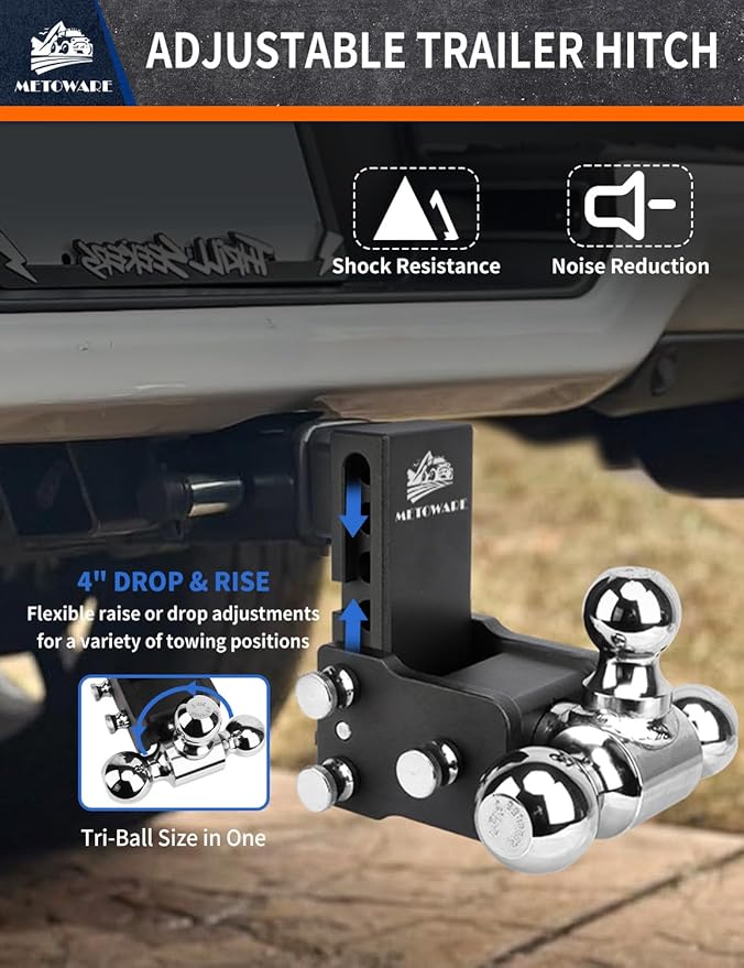 METOWARE Adjustable Trailer Hitch Ball Mount-Fits 2.5" Receiver-Heavy Duty Drop Hitch, Tri-Ball (1-7/8" x 2" x 2-5/16") 4" Drop/Rise, 18,000 GTW and Anti-Theft Stainless Steel Lock