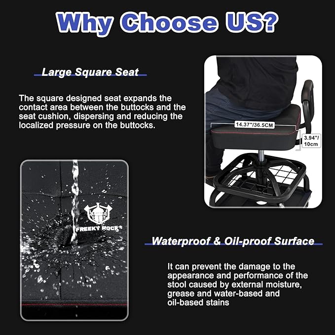 - 【Thickened Seat Cushion】14.37"/36.5CM Diameter Seat. 3.94"/10 CM height cushion. The thickened memory foam padded cushion seat is larger than other garage work stools. The cushion surface of stool is made of PVC material which is waterproof and oilproof, making it easy to be cleaned