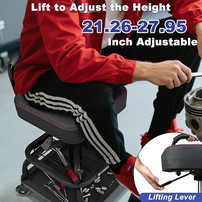 - 【Adjustable Height】21.26-27.95 inch.This garage shop stool is equipped with a pneumatic adjustable mechanism, allowing easily adjust the height from 21.26 to 27.95 inch.Adjust the right height to do your work