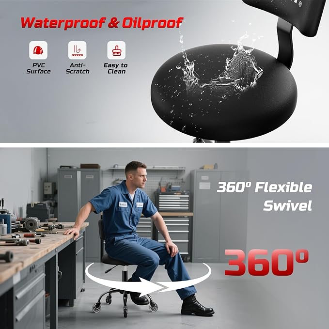 - 【Easy to Move】The flexible 360°swivel garage chair provides larger range of motion and movement. It is equipped with 5 universal casters, the work stool can be flexible,durable and smooth quiet movement on different surfaces.
