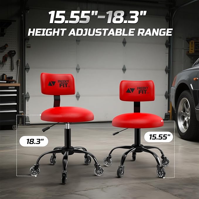 - 【Adjustable Height】15.55-18.3 inch.This garage shop stool is equipped with a pneumatic adjustable mechanism, allowing easily adjust the height from 15.55 to 18.3 inch,it is more suitable for low level auto work,adjust freely the right height
