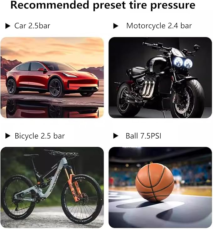 - 💨 Smart Tire Inflator with Auto Stop Built-in air hose and digital tire pressure detection ensure precise inflation. The 19-cylinder 540 motor delivers 22L/min airflow, reaching up to 150PSI. Automatically stops when reaching preset pressure. Includes 5 inflation modes for cars, bikes, balls, and more.