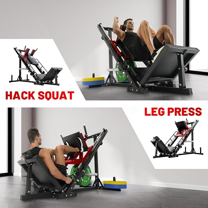 - 【Stability & Versatile Workout】This two-in-one leg press and hack squat machine, red model, adopts linear bearings rather than rolling ones, and it is constructed of heavy-duty high tensile beefy steel. Beyond that, there are two weight plate storage holders at the rear bottom, when stacked up, greatly enhance machine's stability when in motion. By adjusting the placement of your feet on the foot plate, you can focus more on training isolating muscle groups.
