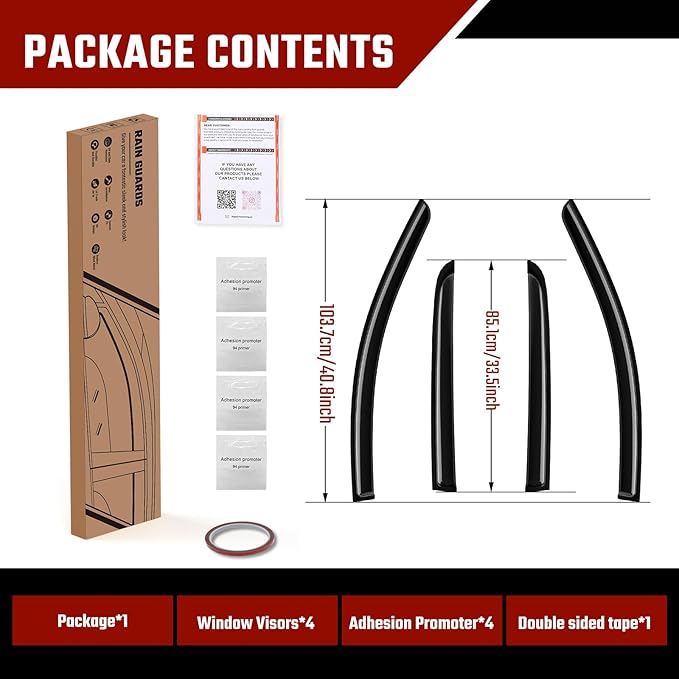 - 【Full-size Side Rain Guards】Engineered to fit your vehicle’s year, make, and model, this seamless side window deflector features a contour- hugging design. This 4-piece set includes passenger and driver side window deflectors that create a seamless look that protects you from sun rays, rain drops, and wind while you’re driving with the window down.