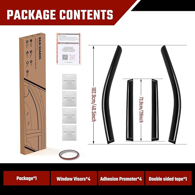 - 【Full-size Side Rain Guards】Engineered to fit your vehicle’s year, make, and model, this seamless side window deflector features a contour- hugging design. This 4-piece set includes passenger and driver side window deflectors that create a seamless look that protects you from sun rays, rain drops, and wind while you’re driving with the window down.