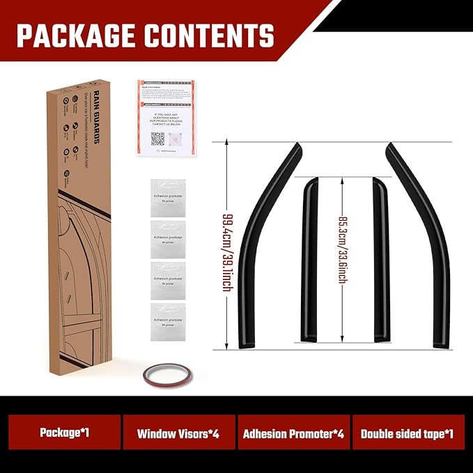 - 【Full-size Side Rain Guards】Engineered to fit your vehicle’s year, make, and model, this seamless side window deflector features a contour- hugging design. This 4-piece set includes passenger and driver side window deflectors that create a seamless look that protects you from sun rays, rain drops, and wind while you’re driving with the window down.