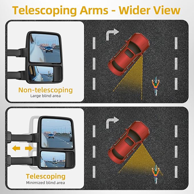 - Multifunctional Features: Feature power-adjustable, power-heated flat mirrors, along with manually adjustable convex lenses. Equipped with integrated amber turn signal indicators, manual telescoping and folding mechanisms