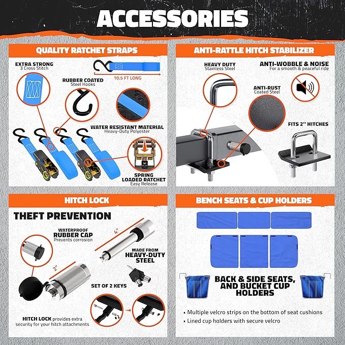 - CUSTOMER CARE COMES FIRST: Mockins stands behind our versatile 2-in-1 hitch storage rack & tailgate seat with a 10-year limited warranty. The trailer hitch luggage rack is designed for cars & SUVs, & comes with a tailgate bench cushion set for added comfort. Also included is a waterproof cargo hitch bag with heavy-duty ratchet & buckle straps to keep belongings secure on the hitch hauler rack. For any issues with your trailer hitch basket cargo carrier , Mockins support is ready to assist.