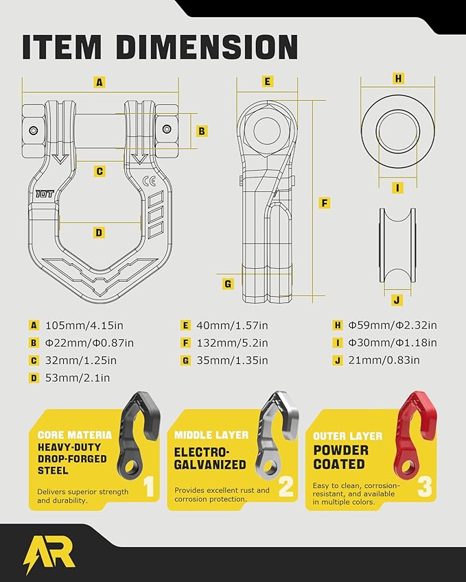 - Universal Fit & Recovery Ready –AUTORICH 3/4” d ring shackle, combined with the 7/8 pin designed for compatibility with a wide range of vehicles and gear, including SUVs, trucks, ATVs, UTVs, and recovery straps. The included rubber spacers help minimize rattling and wear, providing a snug fit and smooth operation when used as a D-ring shackle. Note: Please remove the rubber washers before using in snatch block mode to ensure optimal pulley performance