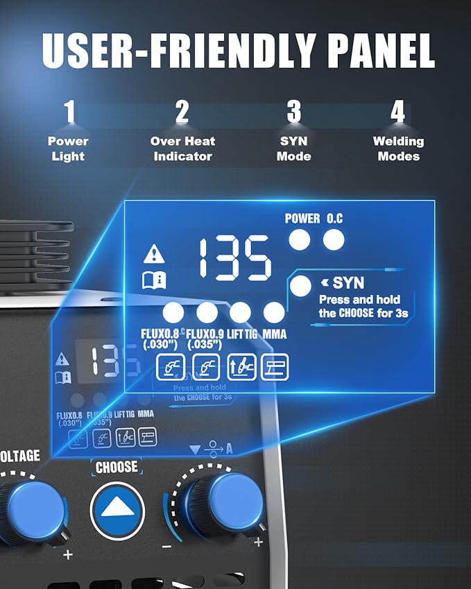 - 【ENHANCED SAFETY AND COOLING SYSTEM】: Equipped with an overheat warning system, this MIG welding machine ensures safe operation by a lighted reminder and a pause in the work, if the machine exceeds safe operating temperatures. The built-in efficient cooling fan system further enhances safety by rapidly dissipating heat to maintain optimal performance.