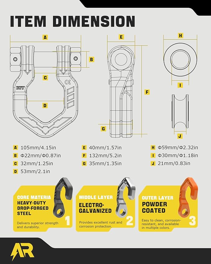 - Universal Fit & Recovery Ready –AUTORICH 3/4” d ring shackle, combined with the 7/8 pin designed for compatibility with a wide range of vehicles and gear, including SUVs, trucks, ATVs, UTVs, and recovery straps. The included rubber spacers help minimize rattling and wear, providing a snug fit and smooth operation when used as a D-ring shackle. Note: Please remove the rubber washers before using in snatch block mode to ensure optimal pulley performance
