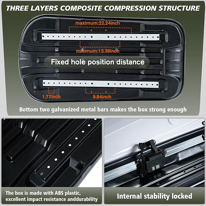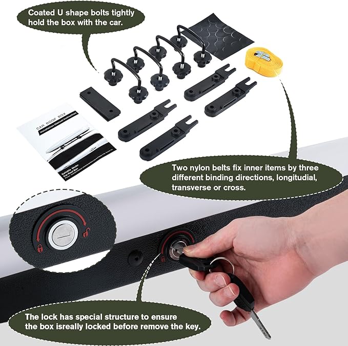 - Secure Locking System & Spacious Interior: Keep belongings safe with the automatic key-release feature—keys remove only when the rooftop cargo box is fully locked. With a generous 13-cubic-foot capacity and a wide 13-inch opening, it easily accommodates bulky luggage, sports equipment, and camping essentials.