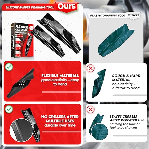- [Premium Quality Oil Funnel] Made from high-quality silicone rubber, this funnel is tough enough to handle high temperatures. Its chemical resistance makes it compatible with most automotive and industrial fluids. Unlike flimsy plastic options, our draining funnel is crease-free and built to last, so you can count on it for countless uses over the years.