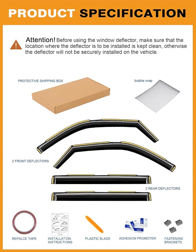 - 【Full-size Side Window Deflectors】This 4-piece set includes passenger, driver side rain guards that create a seamless look that protects you from sun rays, rain drops, and wind while you’re driving with the window down.