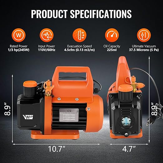 - Wide Compatibility: The provided hoses and manifold gauge are suitable for various refrigerants like R134a, R12, R22, and R502, and this AC vacuum pump versatile for Mini Split,HVAC and AUTO AC repair;Note:The pump must be operated at 110V,and before using the pump, add pump oil to prevent overheating