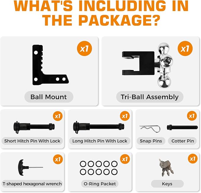 - ADJUSTABLE TRAILER HITCH: Kingfun trailer hitch 6 drop hitch 2 inch receiver ball mount is height adjustable, facilitating horizontal towing. Pull the stainless steel adjustment pin, adjustable 6 inch drop down depth and 6 inch rise height for easy adjustment makes it really fast to change ball mount height to match the hole until it reaches the optimal level of the trailer combination