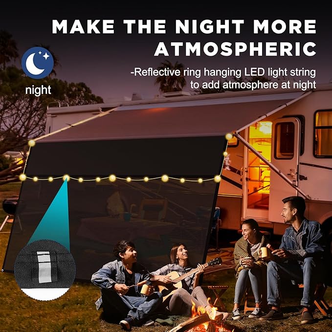- [Superior Sun Protection and Privacy] Our RV awning screen is made from heavy-duty 600D Oxford cloth and 8.11 oz vinyl mesh, providing 90% UV protection, lowering the internal temperature while maintaining 360°airflow, and keeping you cool and private.