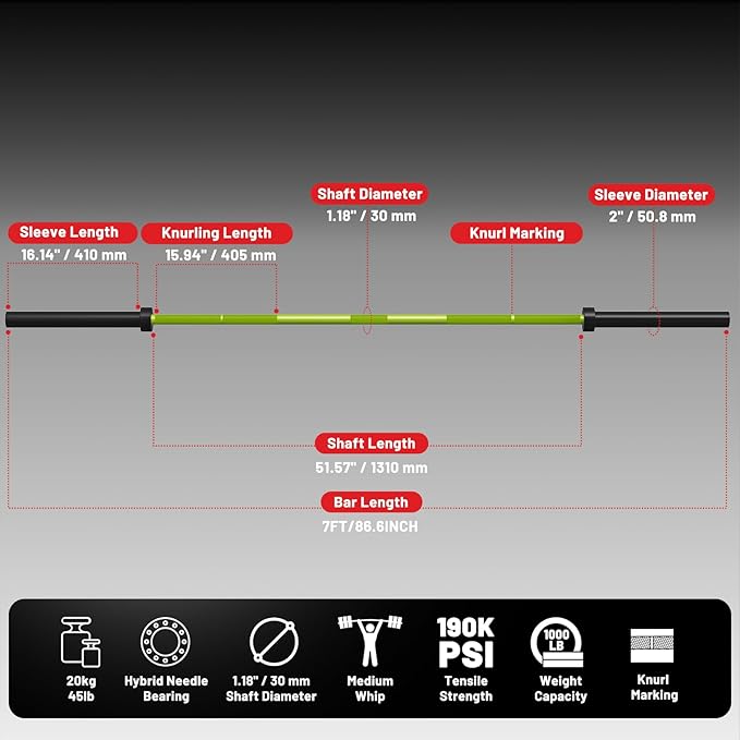 - 2-Inch Sleeves – Anti-Scratch & Universal Compatibility: Features a knurled grip designed for secure handling without aggressive abrasion and fits bumper plates. Compact 7ft design saves space while maintaining a 45 lb balanced weight.